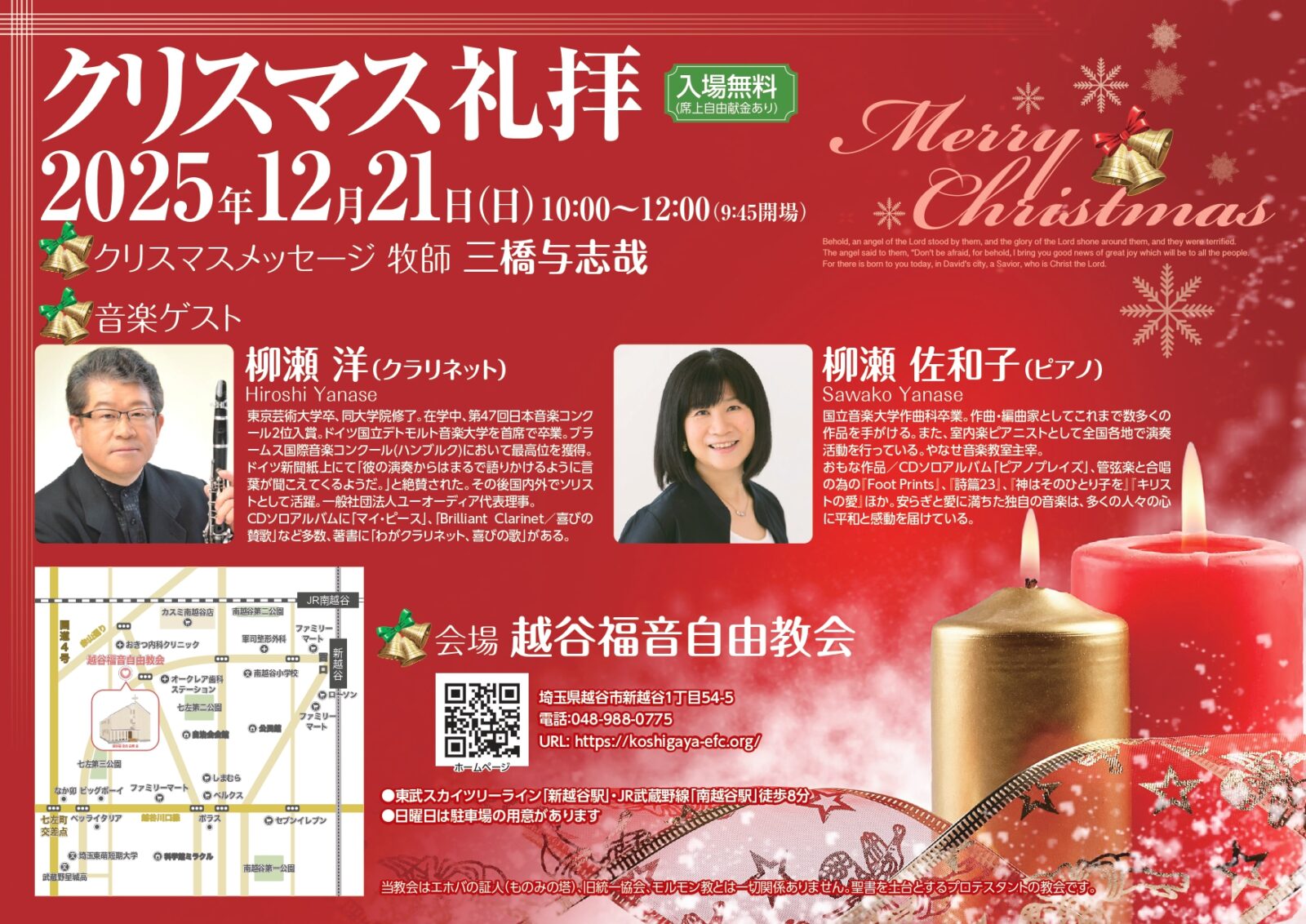 クリスマス礼拝のお知らせ 2025年12月21日(日) 投稿日 2025年11月2日 著者 植村和樹 カテゴリー お知らせ 今年も越谷福音自由教会にてクリスマス礼拝を行います。新会堂に移転してから初めて迎えるクリスマス礼拝となります。当日は音楽ゲストであるクラリネット奏者 柳瀬 洋さんによるクラリネットの演奏とピアニスト柳瀬 佐和子さんによるピアノの演奏といった特別賛美などがあります。どなたもご参加いただけます。ぜひご友人、お知り合いの方、ご家族の方をお誘いの上お越しください!